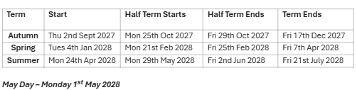 Firstly, the term dates for the 2027/2028 academic year have now been released. We know how important early notice is for family planning, holidays, and childcare arrangements, so please take some time to look through the dates provided below.